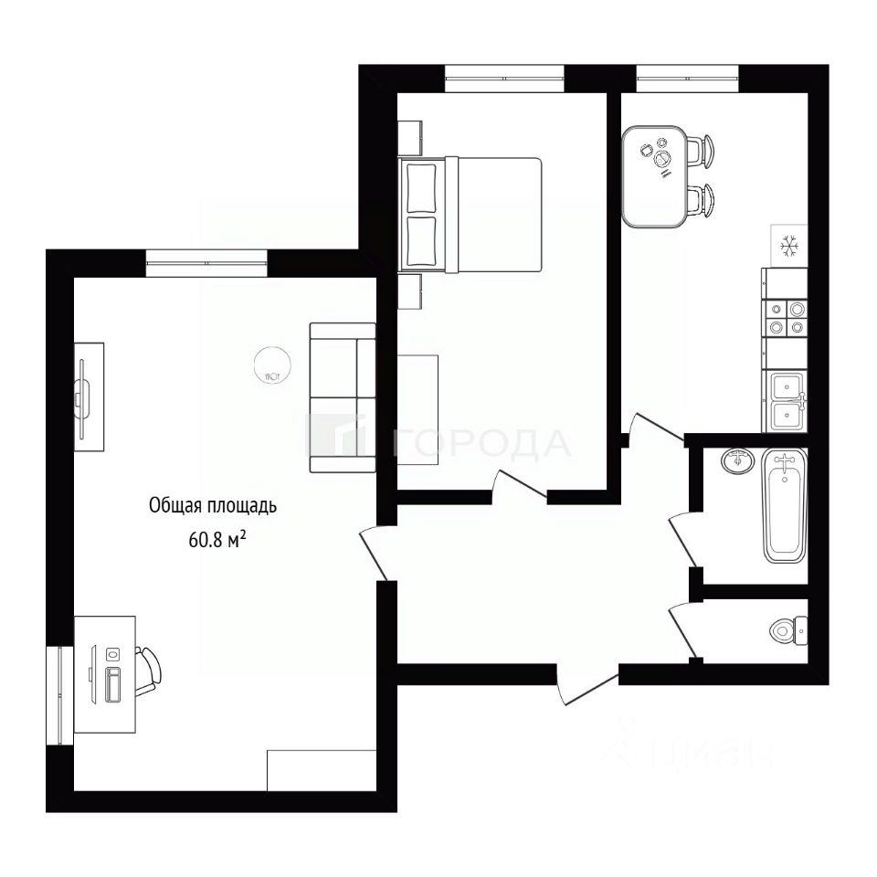 В квартире выполнен аккуратный косметический ремонт. Гостиную можно зонировать, если есть необходимость (в ней два окна).