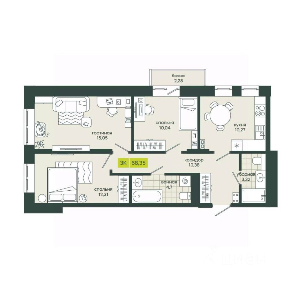 Общая площадь68,35 м²