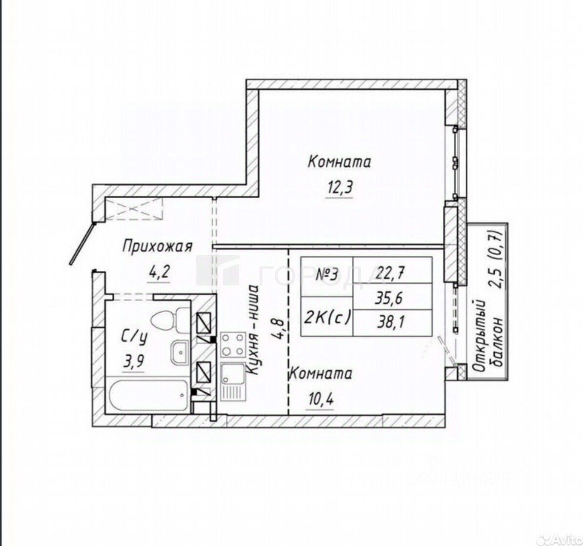 Общая площадь квартиры составляет 38 кв. м, жилая — 22,7 кв. м., кухня — 4,8 кв. м. Есть удобная лоджия, где можно организовать зону отдыха. Окна выходят на улицу.