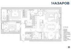 Планировочное решение включает в себя: холл, гардеробную для верней одежды, кухню - гостиную с окнами, выходящими на Нарымский сквер, детскую, мастер - спальню с гардеробной и санузлом, хозяйственную комнату, второй санузел.