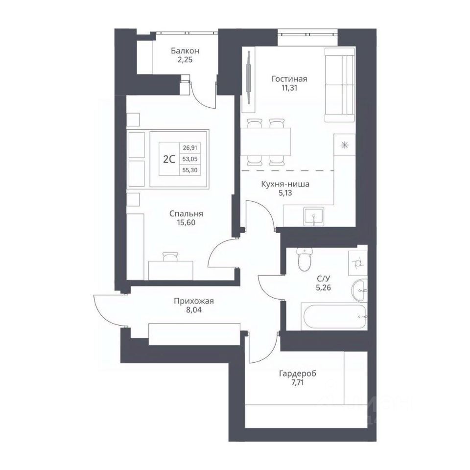 Продается 2-комн. студия с отделкой White box. Квартира расположена на 2 этаже 24 этажного монолитно-кирпичного дома в Акцентном доме "Актив" от группы компаний "Поляков".