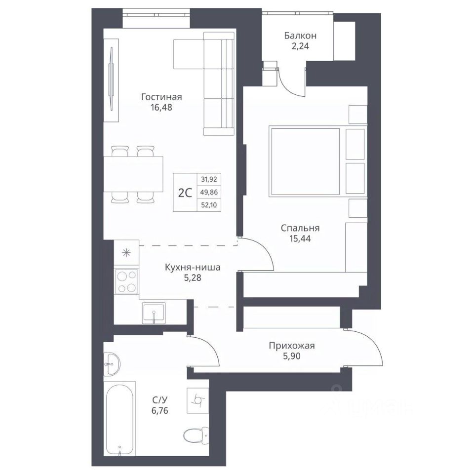 Продается 2-комн. студия с отделкой White box. Квартира расположена на 2 этаже 24 этажного монолитно-кирпичного дома в Акцентном доме "Актив" от группы компаний "Поляков".