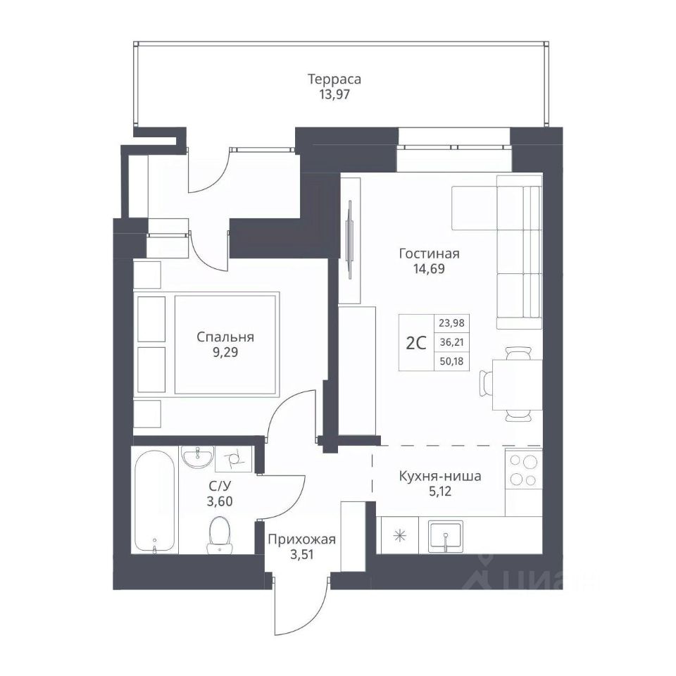 Продается 2-комн. студия с отделкой White box. Квартира расположена на 2 этаже 24 этажного монолитно-кирпичного дома в Акцентном доме "Актив" от группы компаний "Поляков".