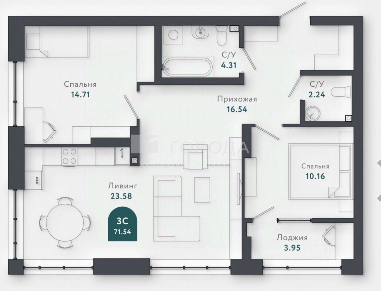 Квартира расположена на Военной улице, 51. Здесь продумана каждая деталь: две изолированные комнаты, два раздельных санузла, общая площадь 71,5 кв. м, из которых 24,84 кв. м — жилая площадь (две прекрасные, отдельные комнаты), а 23,58 кв. м — кухня-гостинная.