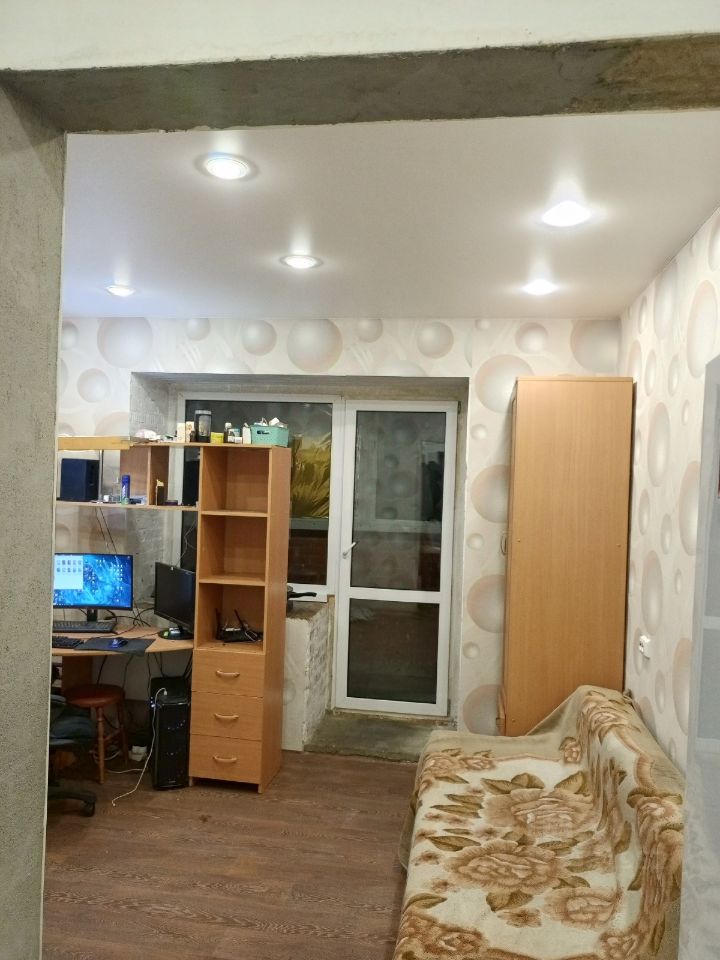 Квартира находится на 9 этаже из 14, не угловая. Соседи только с 1 стороны и эта стена звукоизолированна.Комната квадратной формы,что очень удобно для мебелирования.В комнате - натяжные потолки,обои,линолеум.В сан узле натяжные потолки,пластиковые панели, на полу кафель.В прихожей - натяжные потолки, стены прогрунтованны и отштукатуренны, можно красить или клеить обои на ваше усмотренние, на полу линолеум. Качественная входная дверь, покупалось отдельно при заселении.В квартире есть не доделки в ремонте. Вид из окна на преддомовую парковку, дествую площадку. Шума от проезжей части не слышно. Несомненным плюсом является своя котельная, перебоев с горячей водой и отоплением нет.