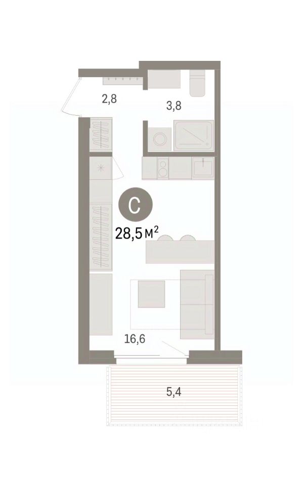 Просторная однокомнатная студия с предчистовой отделкой в ЖК "Пшеница" на 7 этаже. Общая площадь: 28.52 кв.м., площадь гостиной 16.6 кв.м., из которых 5 кв.м. выделено под кухонную зону. Все окна выходят на одну сторону. В квартире один балкон, один совмещенный санузел. Высота потолков 2.82 м.