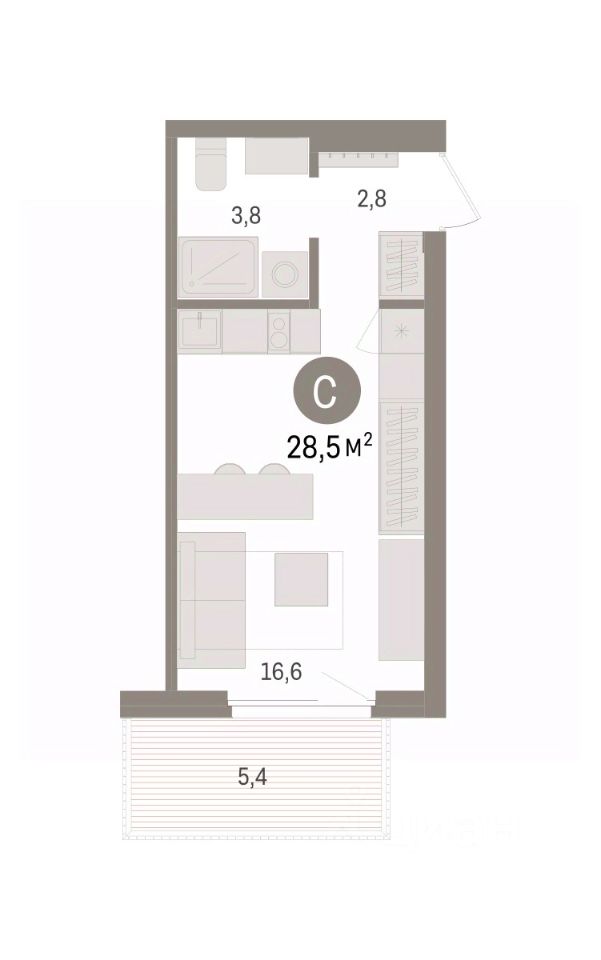 Продается 1-комн. студия с предчистовой отделкой в ЖК "Пшеница" на 5 этаже. Общая площадь: 28.52 кв.м., площадь гостиной 16.6 кв.м., из которых 5 кв.м. выделено под кухонную зону. Все окна выходят на одну сторону. В квартире один балкон, один совмещенный санузел. Высота потолков 2.82 м.