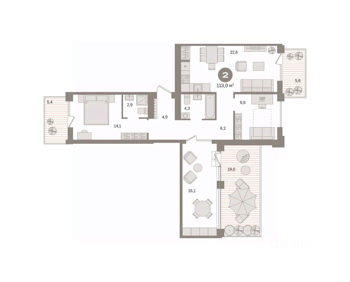 Квартира с кухней-гостиной и двумя спальнями в жилом районе "Пшеница". Особенности планировки: окна на две стороны, гардеробная, окна в пол, вид во двор, разнесённые спальни, предчистовая отделка, мастер-спальня, летняя кухня на крыше, балкон, терраса на крыше.