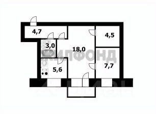 Общая площадь 43,5 кв м, гостиная 18,0, спальня 7,7, "тещина" комната 4,5, кухня 5,6, санузел 3,0, коридор 4,7. Окна пластиковые, установлены новые радиаторы отопления, можно сразу приступить к ремонту.