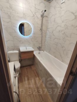 В санузле установлена акриловая ванна, унитаз, раковина с тумбой, электрический полотенцесушитель, стиральная машина на 6 кг.