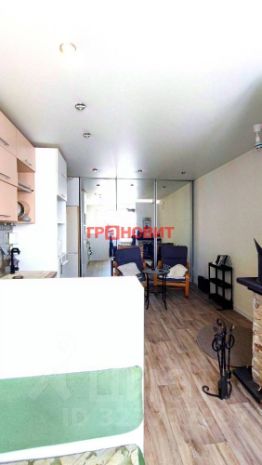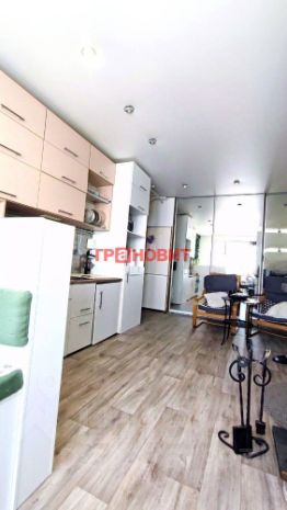 Кухня-гостиная с отдельной обеденной зоной и зоной отдыха, кухонная мебель (с встроенной духовкой и варочный поверхностью), вместительный, встроенный зеркальный шкаф, холодильник, диванчик.