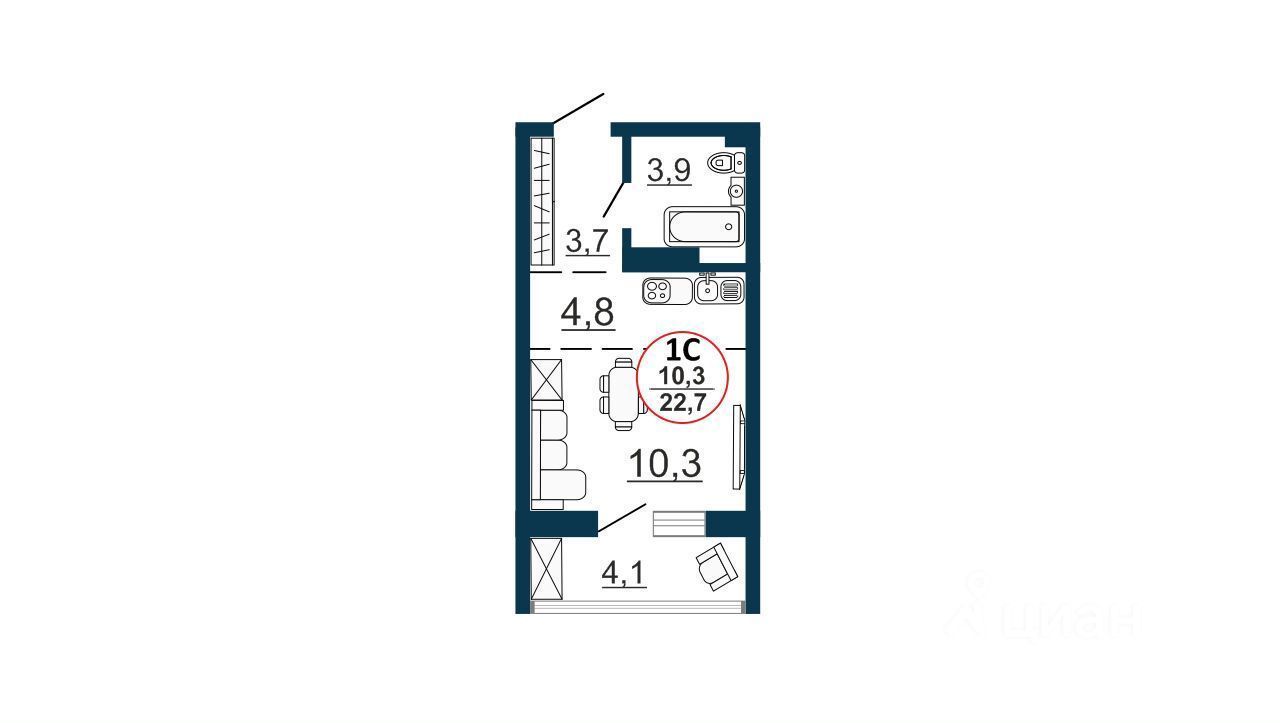 OБЩAЯ ПЛОЩAДЬ КBАРТИРЫ С ЛОДЖИЕЙ 26,7 кв. мeтpoв (22,6+4,1)