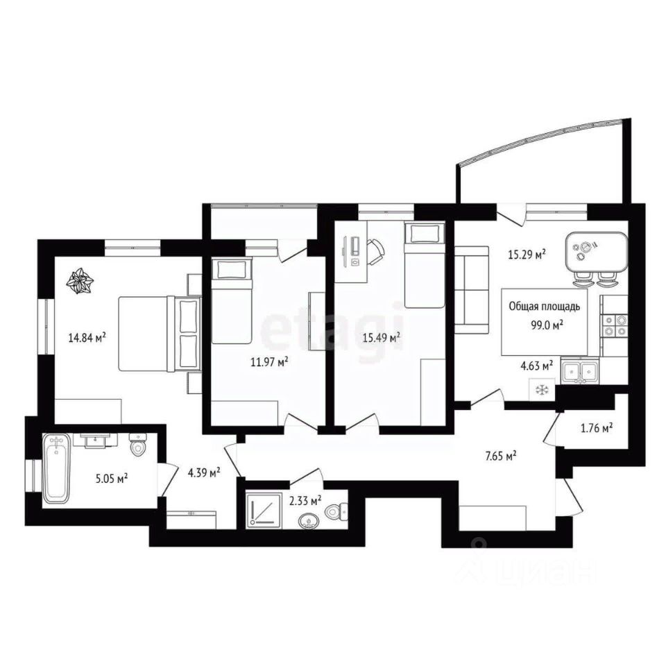 Балкон кухни гостинной включен в общую площадь, фактическая площадь квартиры 100 м кв.