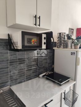 В подарок будущему владельцу остаётся большой вместительный шкаф (хватит для размещения на 2 взрослых человек), стол (можно убрать ножку и в сборном состоянии стола в комнате будет ещё больше места), тумба с раковиной, напольная тумба, навесной шкаф, кухонный гарнитур, полка для микроволновки и холодильник, гардина со шторами (блэкаут).