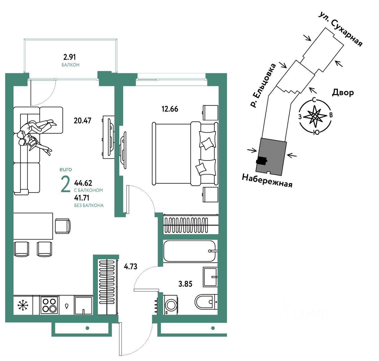 Продается 2комнатная квартира на 3 этаже от застройщика Страна Девелопмент. Площадь квартиры 44,62 кв. м.