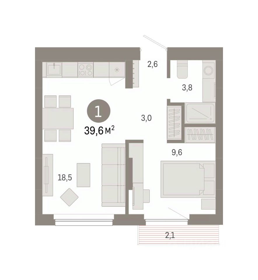 Квартира с кухней-гостиной и одной спальней в квартале "Лебедевский". Особенности планировки: предчистовая отделка, балкон.