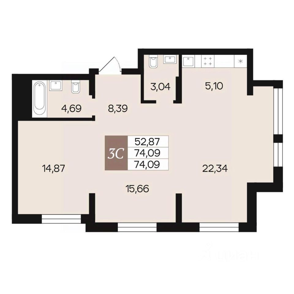 Общая площадь74,09 м²