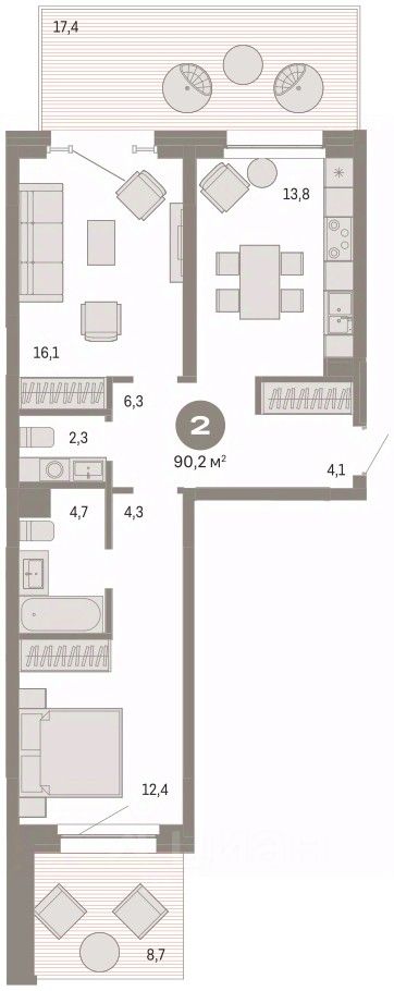 2-комн. квартира от застройщика с предчистовой отделкой в Квартал На Декабристов на 2 этаже. Общая площадь: 90.19 кв.м. Высота потолков 2.81 м.