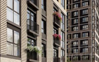 Внутренняя территория огорожена и разделена ландшафтным озеленением с учетом сезонности, поэтому с весны до поздней осени двор будет радовать вас яркими красками.