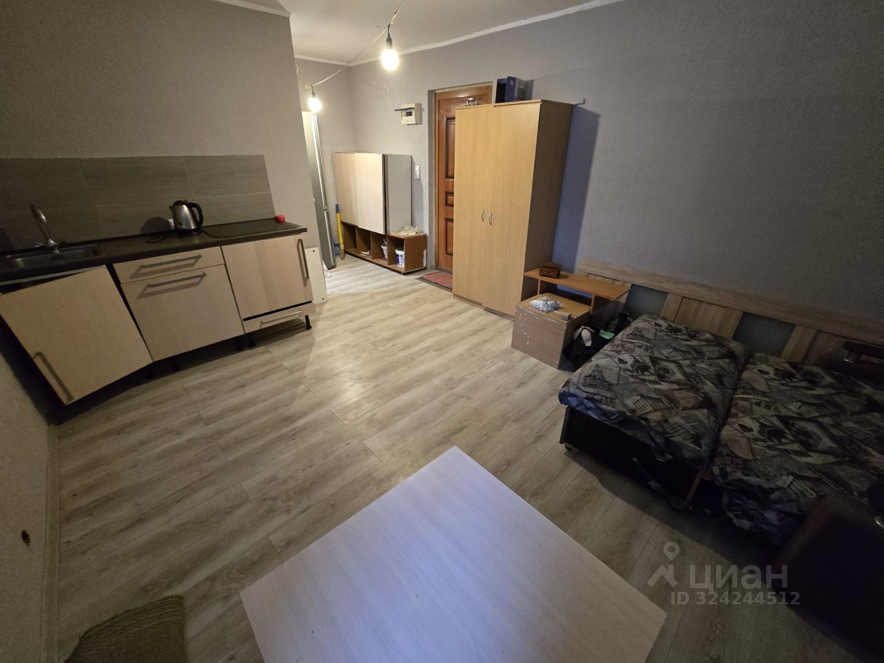 Мебель и техника остаются покупателю:В комнате: кухонный гарнитур, диван, шкаф, стол.В санузле: душевая кабина, стиральная машина.
