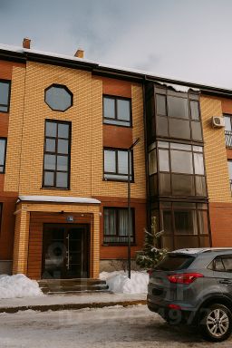 Продуманная архитектура. Кирпичный дом, входные группы на уровне земли. Для владельцев автомобилей предусмотрены открытые парковочные места.
