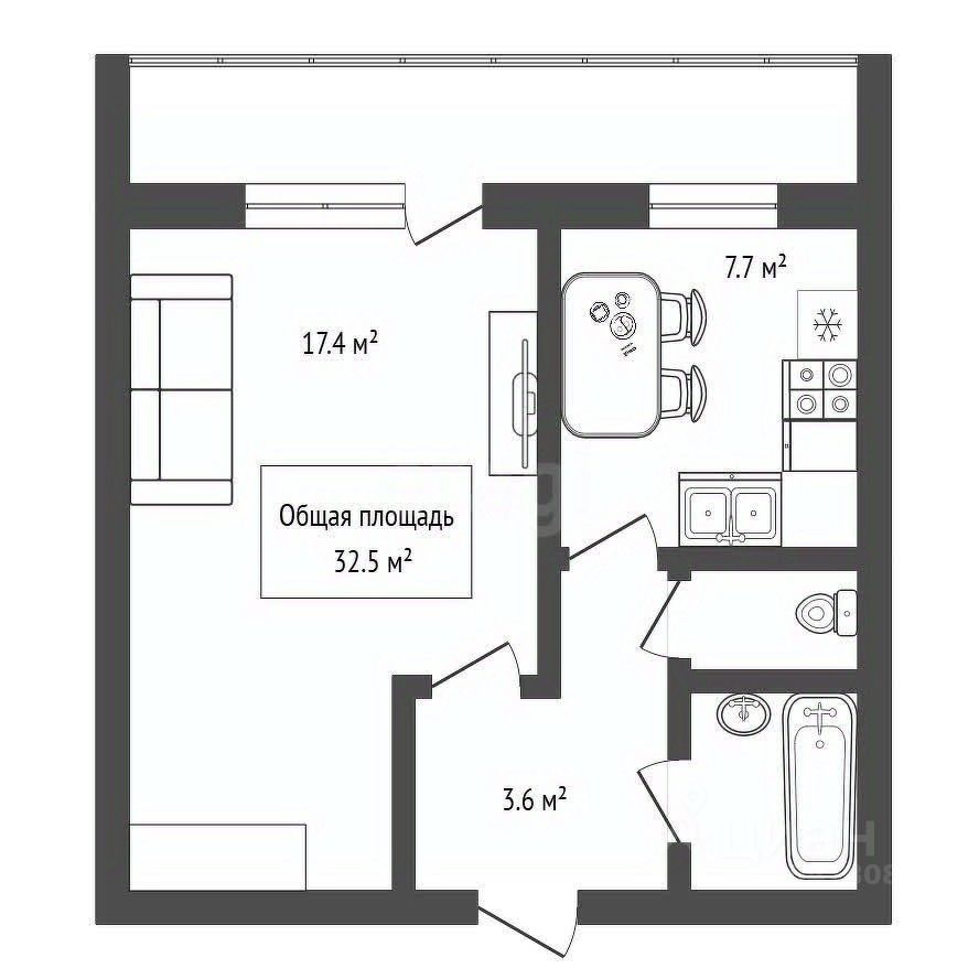 Общая площадь квартиры составляет 32,5 м2, с кухней площадью 7,7 м2.