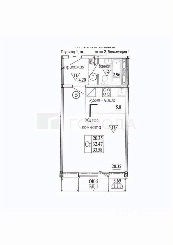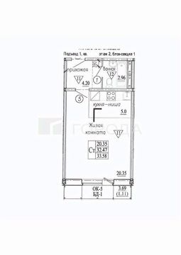 Квартира расположена на втором этаже десятиэтажного панельного дома, построенного в 2025 году. Общая площадь — 33,6 кв. м, высота потолков — 2,6 м. В квартире один совмещённый санузел и есть балкон. Окна выходят на улицу.