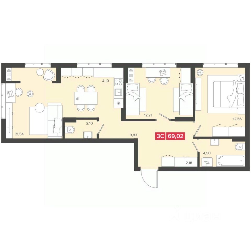 Общая площадь69,02 м²