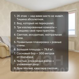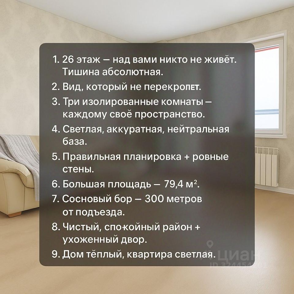 Трёхкомнатная квартира, в которую легко влюбиться Светлая, тёплая, просторная — и просто идеальная основа для ремонта под себя Если вы ищете не просто жильё, а место, где можно создать свой семейный уют, свой стиль, своё настроение — эта трёшка на 26 этаже подходит идеально. Она уже чистая, аккуратная, светлая — в неё можно въехать сразу. А если захотите — сможете постепенно сделать всё так, как давно мечтали, не переплачивая за чужой ремонт и чужие вкусы. Планировка, которую ценят семьи Три полностью изолированные комнаты Каждый может иметь своё пространство — дети, взрослые, гости. Очень удобно для семейного ритма. 79,4 м² правильной формы Комнаты не узкие и не ломанные — всё ровно, аккуратно, удобно для мебели и дизайна. Нейтральные светлые стены Можно жить сейчас. А можно: — перекрасить в любимый оттенок, — наклеить обои, — сделать акцентные стены, — оформить детскую. Это база, которую легко преобразовать под свой вкус. 26 этаж — тишина, свет и невероятный воздух Наверху всегда спокойнее. Нет шума сверху. Нет соседских окон напротив. Перед вами открытое пространство: город, небо, линии горизонта. Эта квартира чувствуется лёгкой, воздух здесь ходит свободно. А вечером вид из окна успокаивает лучше любого сериала. Прекрасное окружение для семьи Всего в нескольких минутах — сосновый бор, где можно гулять с детьми, кататься, дышать свежим воздухом. Во дворе: • хорошие детские площадки • спортивный корт • баскетбол, волейбол • широкие дорожки Всё чисто, ухоженно, спокойно. Рядом — садики, школы, развивашки, кружки. Всё, что нужно семье, — буквально под рукой. Можно въехать сейчас — а ремонт сделать потом, не спеша • Квартира в жилом состоянии • Ничего не давит, не пугает • Нет тяжёлых цветов, спорных решений • Вся основа — нейтральная и аккуратная Это редкий вариант: жить можно прямо сейчас, а интерьер постепенно довести до мечты. Документы полностью готовы. Квартира без обременений. Переезд — лёгкий и спокойный. Цена: 8 600 000 ₽ За просторную трёшку, высокий этаж, тишину, вид и лучший район — очень хорошее предложение. Если вы ищете квартиру, где сможете создать настоящий семейный дом, напишите — я с удовольствием покажу её в любое удобное время