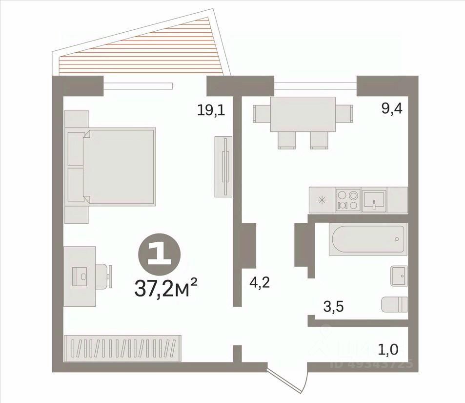 Однокомнатная квартира площадью 37,2 кв.м.