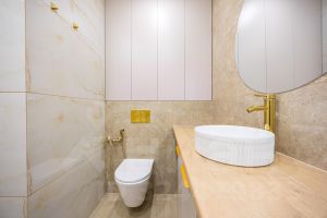 современная сантехника, зеркало с подсветкой в санузле.