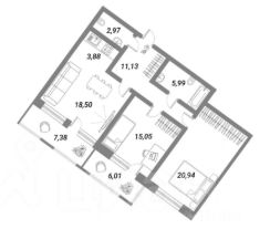 Просторные комнаты: гостиная 22,38м², спальни 15,05 м² и 20,94 м²