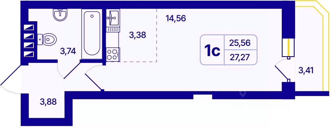 Продается 1-комн. квартира-студия от застройщика с предчистовой отделкой в ЖК "Астон. Шесть Звезд" на 21 этаже. Общая площадь: 27.27 кв.м., площадь гостиной 17.94 кв.м., из которых 3.38 кв.м. выделено под кухонную зону. Все окна выходят на одну сторону. В квартире один балкон, один совмещенный санузел. Высота потолков 2.65 м.