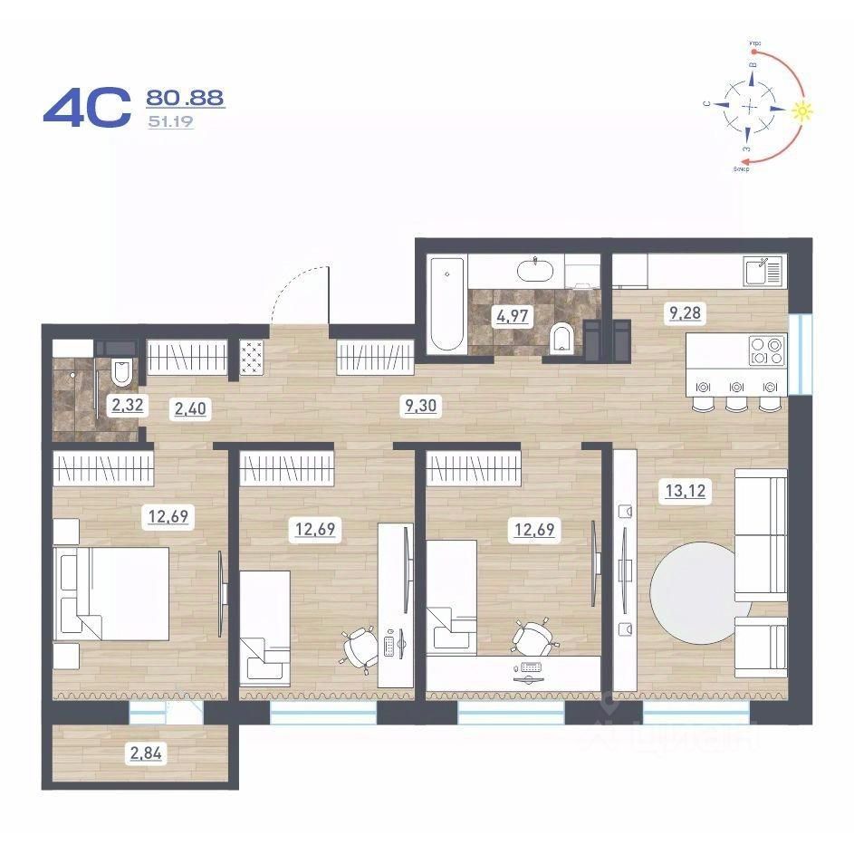 Продаётся 4-комнатная квартира в строящемся доме (Дом 10), срок сдачи: IV-кв. 2025, общей площадью 80.88 кв.м., на 12 этаже. Расположение, транспортная доступность