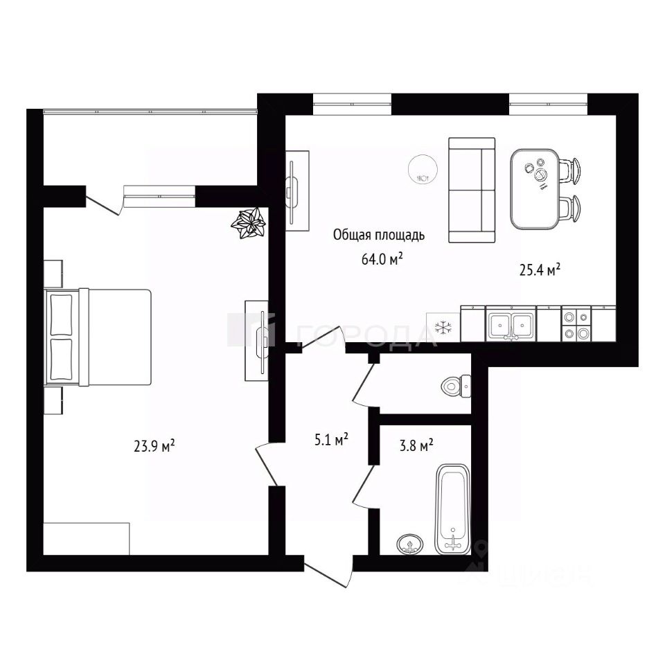 Общая площадь — 63 кв. м, жилая — 42 кв. м, площадь кухни —7 кв. м. Две изолированные комнаты, евроремонт, санузел раздельный.
