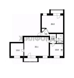 Общая площадь квартиры 95,2м2, гостиная 33,1 м2, две комнаты(26 и 10,6м2), кухня 10,8 м2.