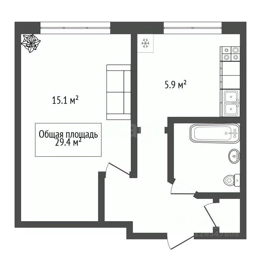 Общая площадь: 29,4 м² | Кухня: 5 м² | Этаж: 1 из 5