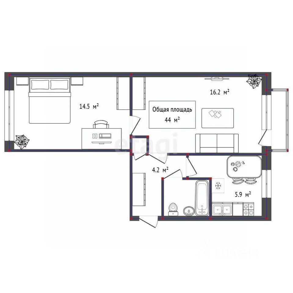- площадь: 44 кв. м;