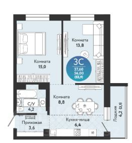 В продаже просторная 3-комнатная студия площадью 56,5 кв.м в сданном доме ЖК Семейный квартал!
