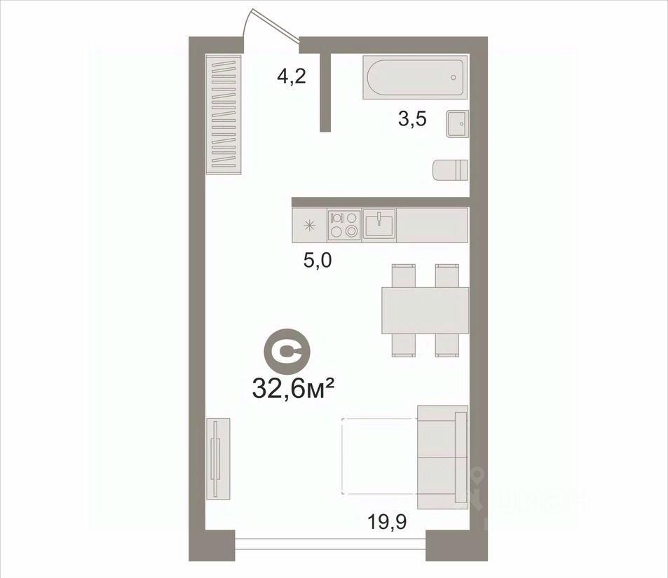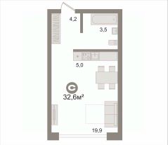 Однокомнатная квартира площадью 32,6 кв.м.