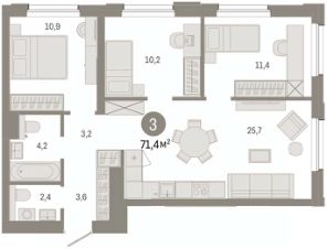 Квартира с кухней-гостиной и тремя спальнями в проекте Город-на-озере. Особенности планировки: второй санузел, предчистовая отделка, разнесённые спальни.