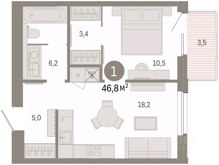 Квартира с кухней-гостиной и одной спальней в проекте Город-на-озере. Особенности планировки: балкон, гардеробная, предчистовая отделка.