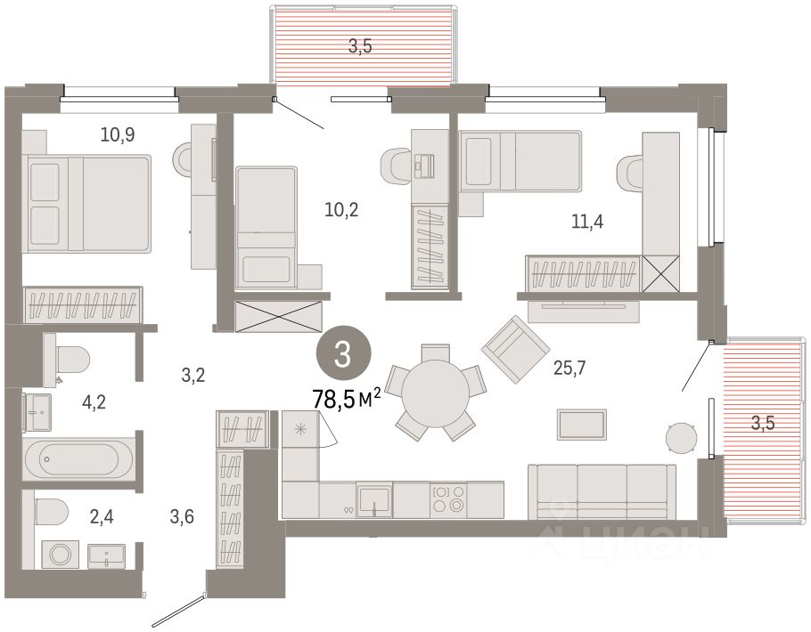 Квартира с кухней-гостиной и тремя спальнями в проекте Город-на-озере. Особенности планировки: балкон, вид во двор, второй санузел, предчистовая отделка, разнесённые спальни.