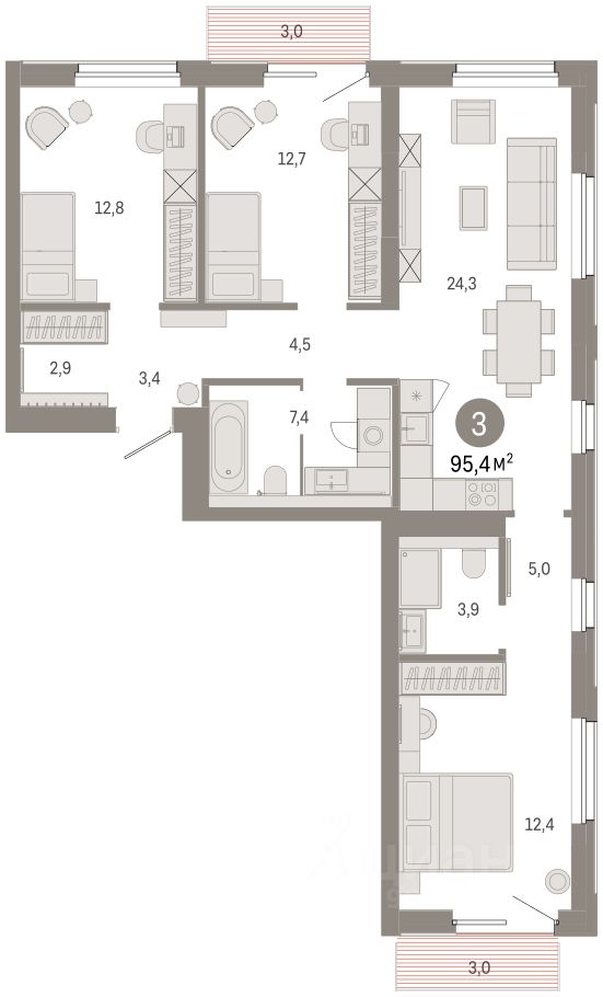 Квартира с кухней-гостиной и тремя спальнями в проекте Город-на-озере. Особенности планировки: балкон, вид во двор, второй санузел, гардеробная, мастер-спальня, предчистовая отделка, разнесённые спальни.