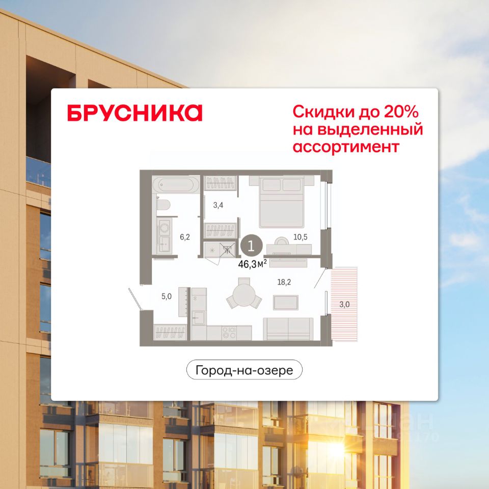 Однокомнатная квартира от застройщика с предчистовой отделкой в ЖК "Город-на-озере" на 4 этаже. Общая площадь: 46.25 кв.м., жилая: 10.5 кв.м., площадь просторной кухни-гостиной: 18.2 кв.м. Все окна выходят на одну сторону. В квартире один балкон, один совмещенный санузел. Высота потолков 3.0 м.