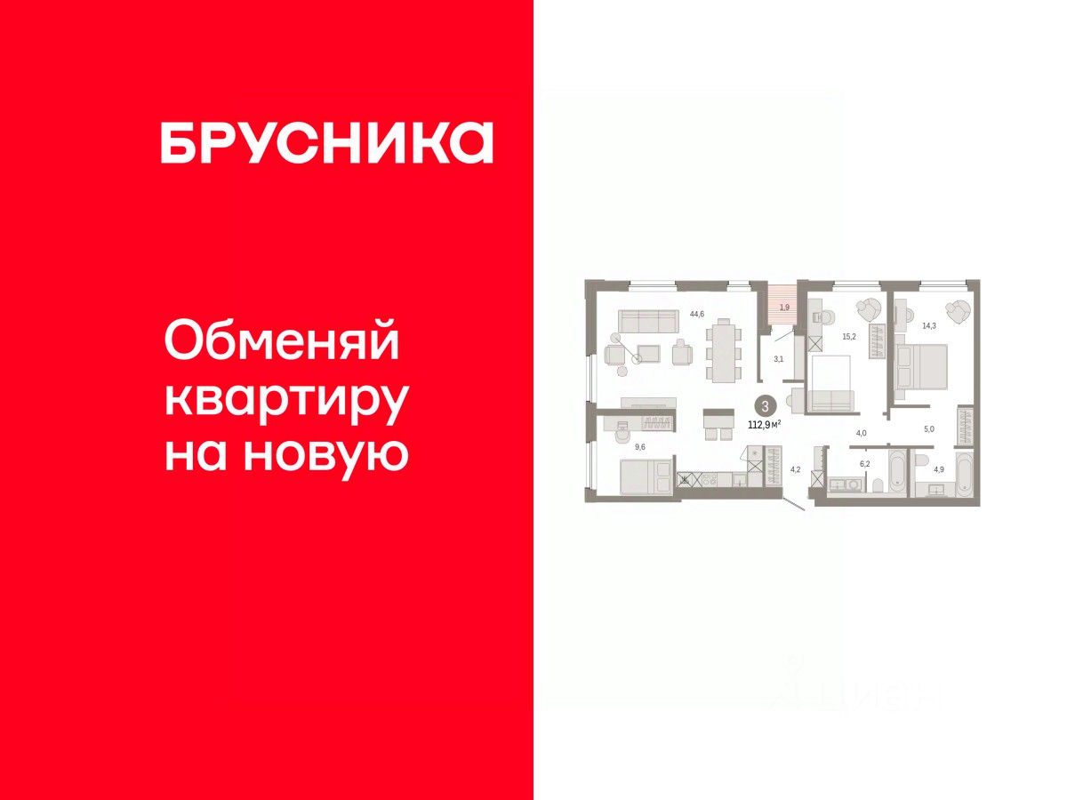 Трехкомнатная квартира с предчистовой отделкой в ЖК "Город-на-озере" на 4 этаже. Общая площадь: 112.93 кв.м., жилая: 39.1 кв.м., площадь просторной кухни-гостиной: 44.6 кв.м. Квартира угловая, окна oбecпeчивaют paвнoмepнoe ocвeщeниe в тeчeниe дня. В квартире одна лоджия, два совмещенных санузла. Высота потолков 3.0 м.