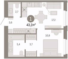 Просторная 1-комн. квартира с предчистовой отделкой в ЖК "Город-на-озере" на 6 этаже. Общая площадь: 43.32 кв.м., жилая: 10.8 кв.м., площадь просторной кухни-гостиной: 17.2 кв.м. Все окна выходят на одну сторону. В квартире один совмещенный и один раздельный санузел. Высота потолков 3.0 м.