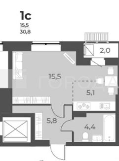 Площадь: общая 30,8 - кв. м, жилая - 15,5 кв. м, кухня - 5,5 кв. м.