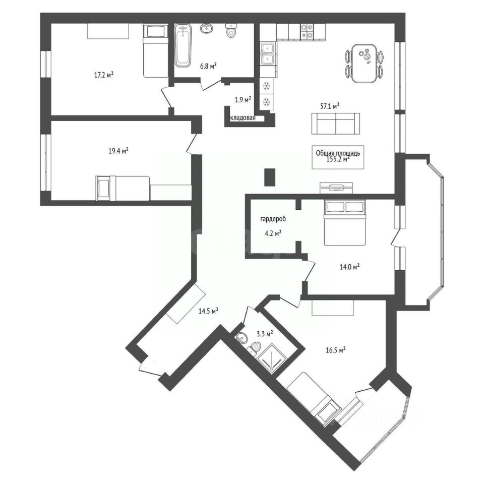 Продаётся просторная 4х-комнатная квартира в престижном микрорайоне Академгородок, Новосибирск. Общая площадь квартиры составляет 155,2 кв. м, жилая — 68 кв. м, а площадь гостиной зоны с кухней 35 кв. м. Расположена на 13-м этаже 14-этажного кирпичного дома. Дом построен в 2018 году.