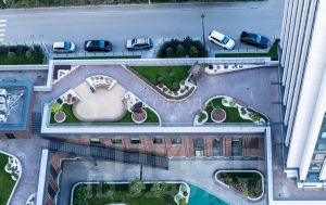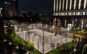 Продуманный двухуровневый двор: детская площадка с мероприятиями от застройщика, спортивная площадка для игры в футбол и баскетбол, на втором уровне двора мини-парк с лавочками и качелями.